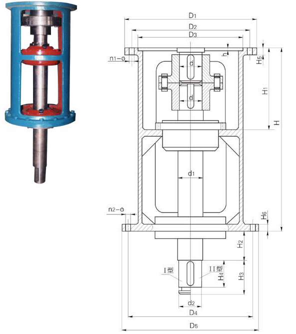 | 機(jī)架型號(hào) | 減速機(jī) | D1 | D2 | D3 | n1-φ | D4 | D5 | n2-φ | d | d1 | d2 | h | H | H1 | H2 | H3 | H4 | H5 | H6 |
